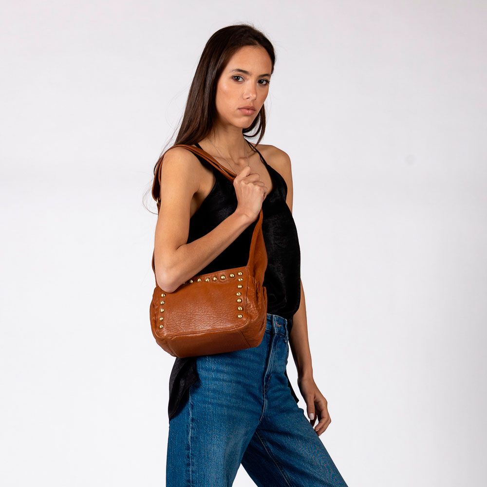 Handmade from high-quality leather, this compact bag combines a soft, supple feel with a structured silhouette that maintains its shape throughout daily use. The deep Cognac tone enhances its versatility, making it suitable for both casual outings and refined occasions. The front is subtly accented with a rock-inspired studded detail, while the back features discreet embossed branding — a signature of artisanal attention to detail.