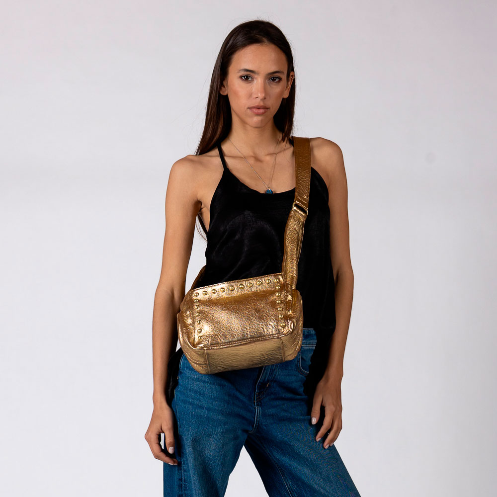 Handmade from high-quality leather, this compact bag combines a soft, supple feel with a structured silhouette that maintains its shape throughout daily use. The deep Gold tone enhances its versatility, making it suitable for both casual outings and refined occasions. The front is subtly accented with a rock-inspired studded detail, while the back features discreet embossed branding — a signature of artisanal attention to detail.
